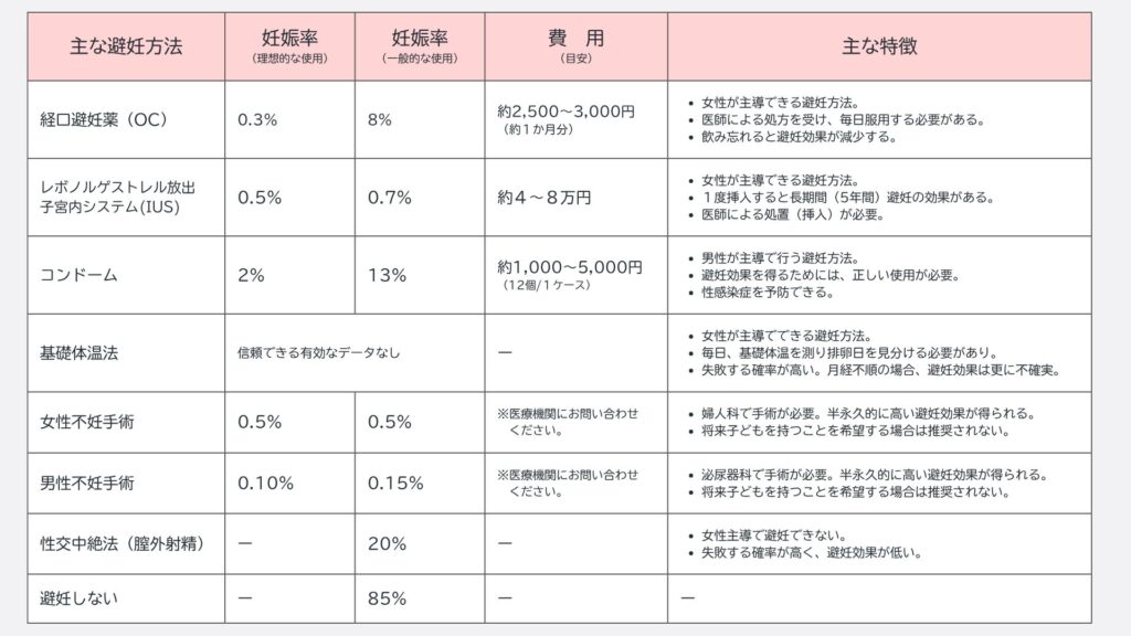 「経口避妊薬(OC)」、「レボノルゲストル放出子宮内システム(IUS)」及び「避妊手術」は、正しく使えば、高い確率で妊娠を防ぐことができる方法です。ただし、性感染症を予防することはできません。性行為の際には、確実性の高い避妊方法に加え、性感染症予防のためにコンドームを使用することがが大事です。